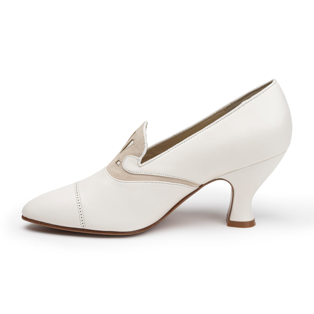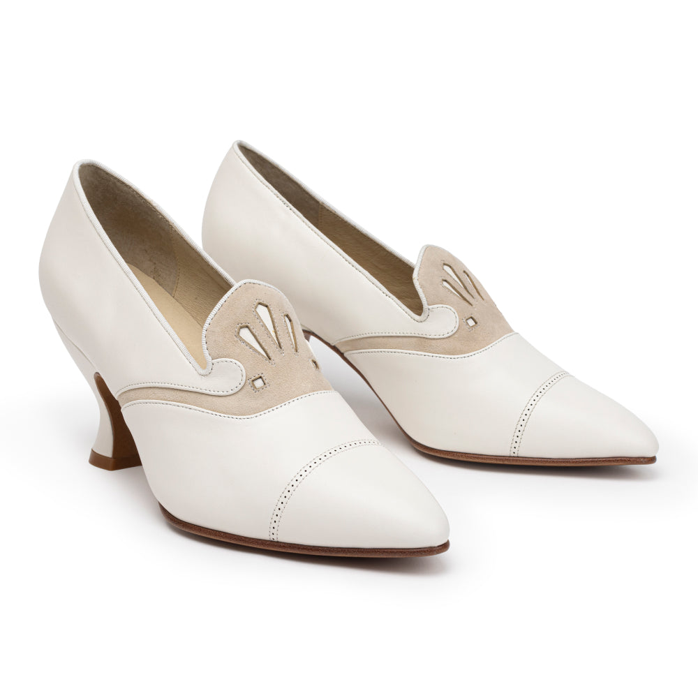 Be utterly beguiling in Elsie Pumps! Meticulously reproduced from period originals, Elsie is accurate to 1890 through 1920. These step-in pumps feature smooth leather and suede uppers in coordinating colors, as well as a distinctive shaped tongue with cutout detailing. Elsie features a custom, perfectly balanced 3”/ 7.6 cm French spool heel, so you can glide across the floor at any soirée. Elsie pairs wonderfully with tea and lingerie gowns as well as evening wear. To keep your Elsies looking spiffy, we recommend pre-treating them with Angelus Water & Stain Repellent.
