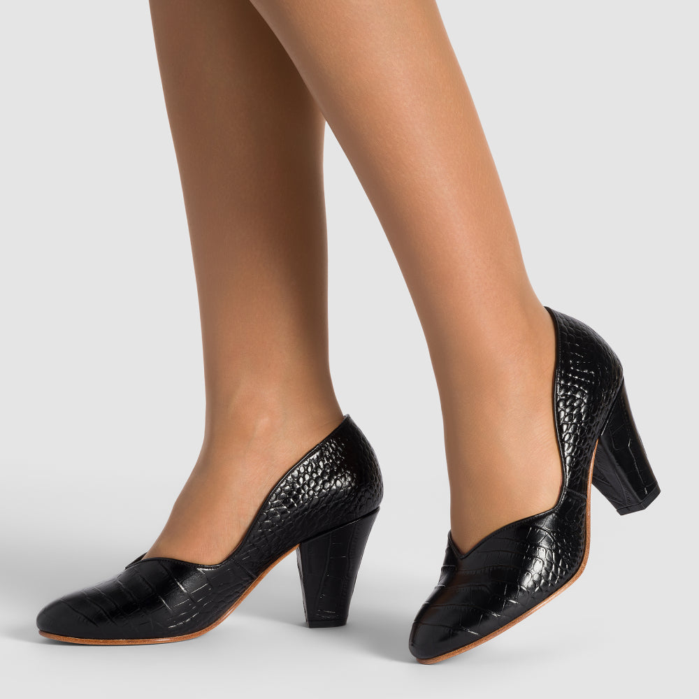 Step into a pair of our famous Marilyn 1940s Pumps, the quintessential vintage slip-on shoe for the late 1930s, 1940s, and early 1950s. Custom embossed leather uppers emulate the elevated, elegant, and in vogue mock croc pumps of the time. These beautiful reproduction shoes feature a curvaceous sweetheart vamp and rounded toes. Our custom 3"/ 7.72 cm reproduction '40s Cuban heel is stable and perfectly balanced for long-wearing comfort. Named for Marilyn Monroe, Marilyn pairs perfectly with just about every outfit for both day and evening.