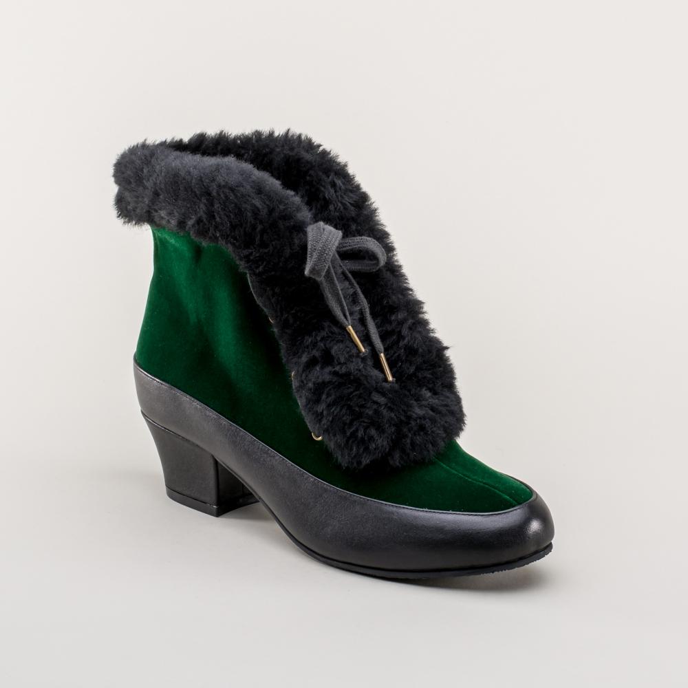 Alpen Retro Winter Booties are just the fashionable footwear you need for your winter vintage outfits. These booties are based on original Montgomery Ward overshoes, also known as galoshes, but are made as regular boots. We've stayed faithful to the velveteen upper and houndstooth lining, opting to use ethically sourced sheepskin trim and leather foxing and heel. These beautiful boots are cozy and practical for winter wear, with rubber soling.