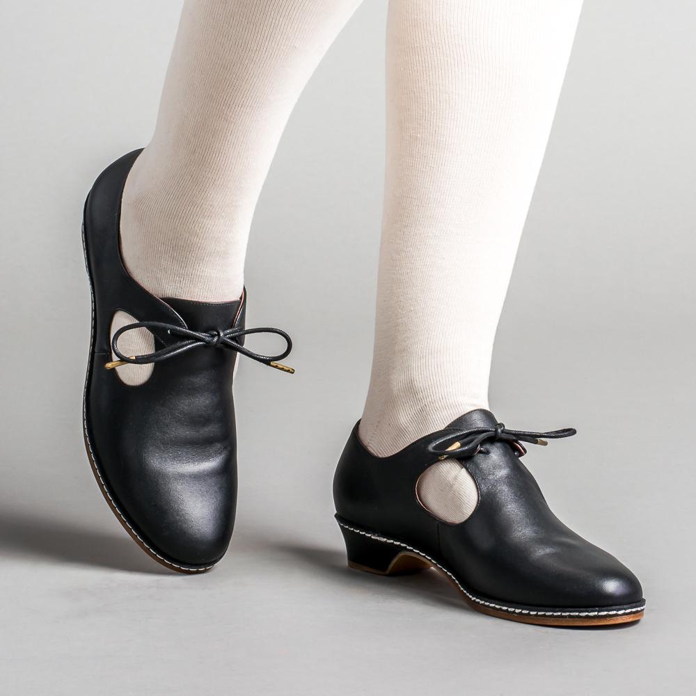 The unique styling of Elizabethan and Renaissance heeled shoes is brought to life with our Mary. A tie closure, open sides, and a low, practical heel makes these late Renaissance era shoes perfect for both indoor and outdoor fairs and events.