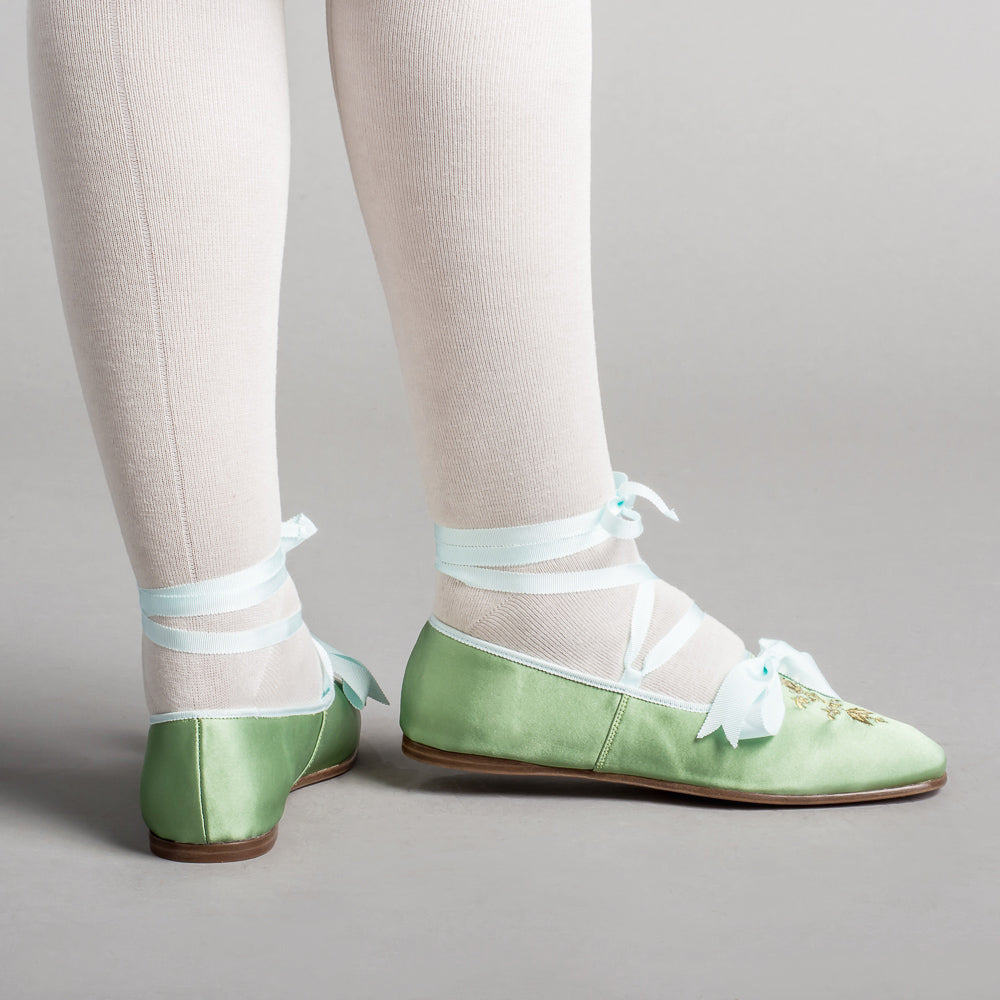Bring your Regency dreams to life with the perfect pair of delicate dancing slippers. The Penelope slippers offer beauty, comfort, and versatility with so many color pairings, ways to wear the ribbons, and a soft yet durable construction.