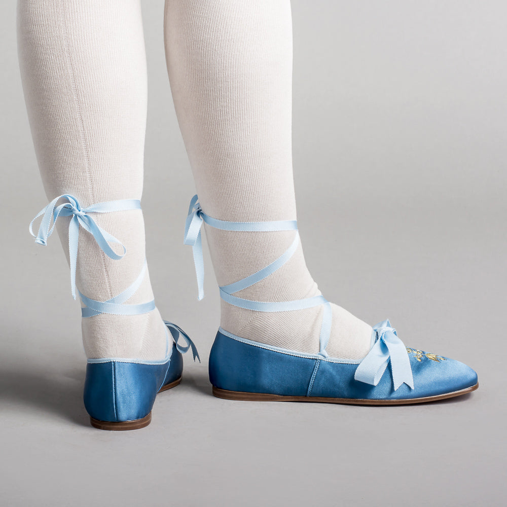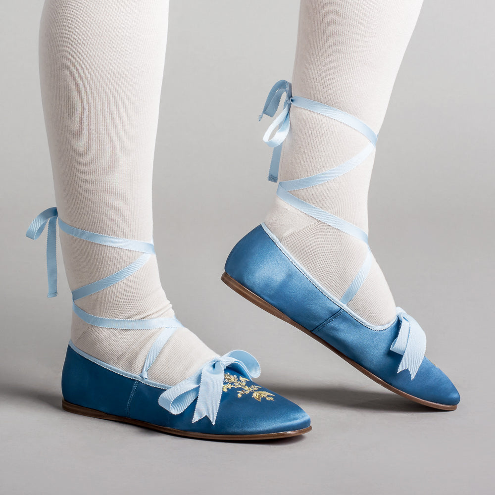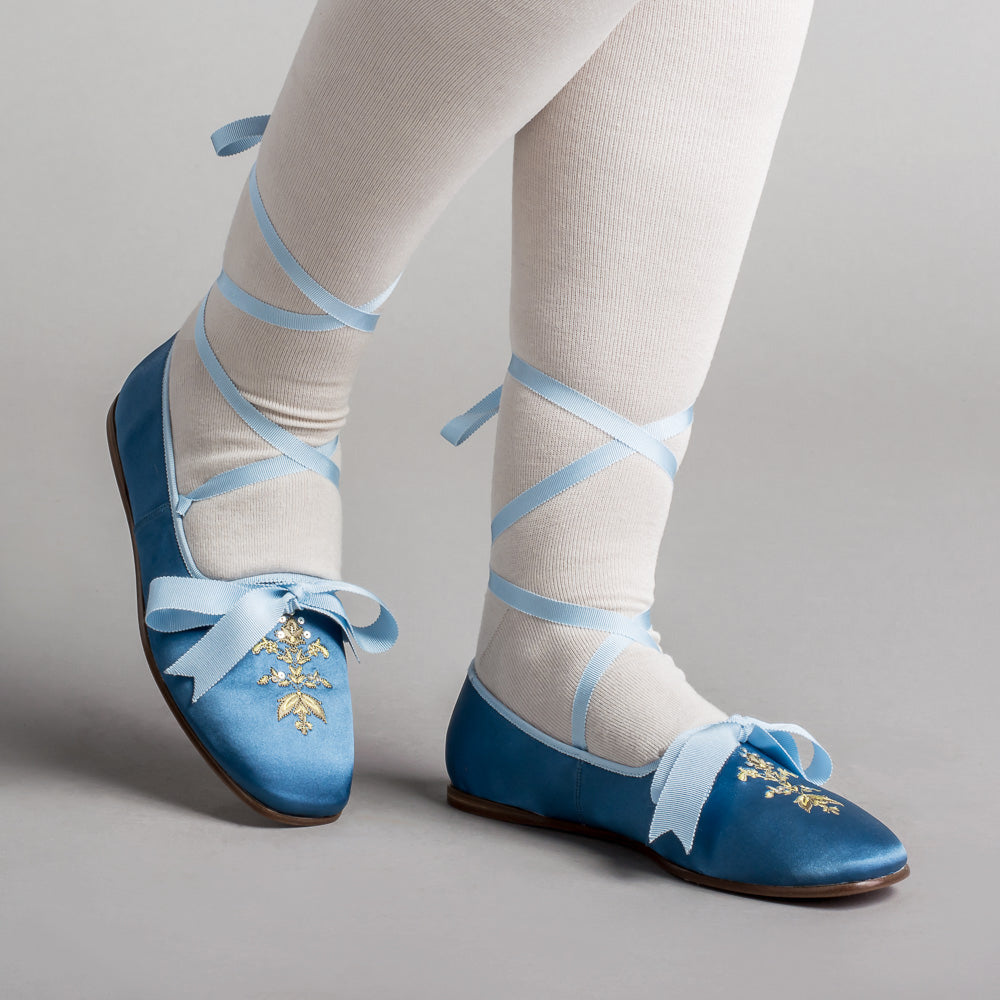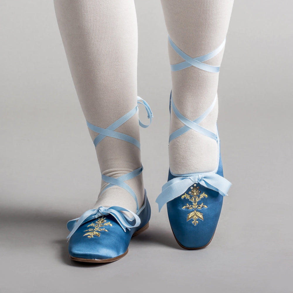 Bring your Regency dreams to life with the perfect pair of delicate dancing slippers. The Penelope slippers offer beauty, comfort, and versatility with so many color pairings, ways to wear the ribbons, and a soft yet durable construction.