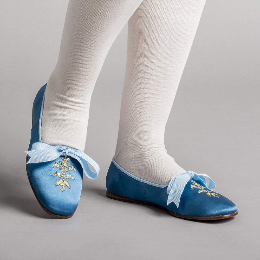 These slip-on shoes are accurate for c. 1800 - 1830. They feature a beautiful satin upper embroidered with a historical design on the vamp, complete with spangles. The edges are bound in petersham, with matching optional ankle ribbons and vamp bow which is easily removed. Period-correct turnshoe construction, soft square toe, and real leather soles make the Penelopes unmatched for evening and formal events where the prettiest of shoes are required. Wear them for Jane Austen, Napoleonic, War of 1812, and all Regency events.