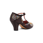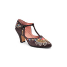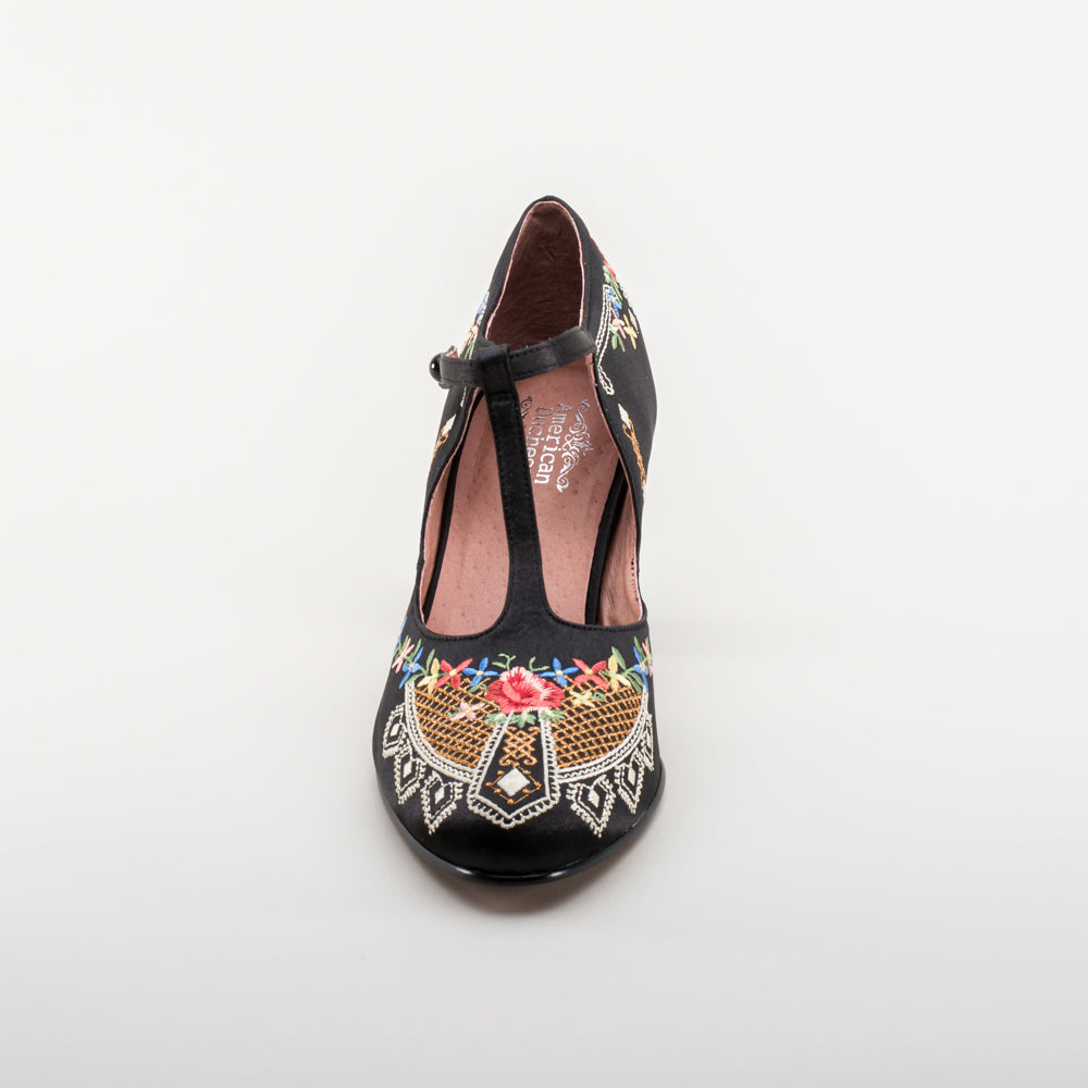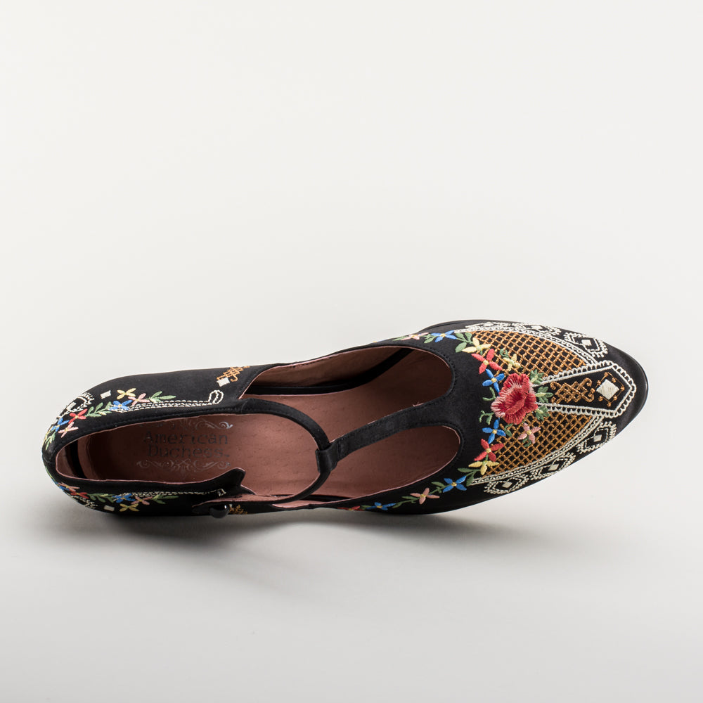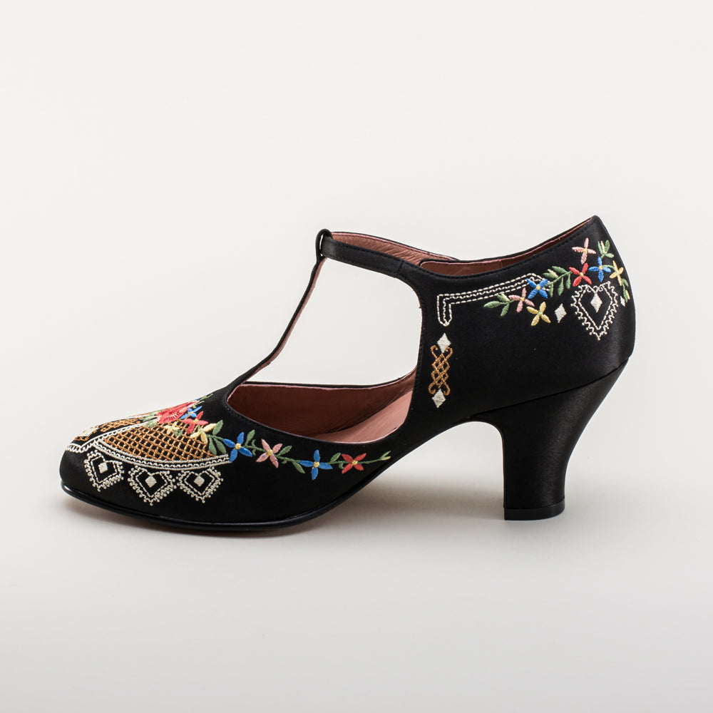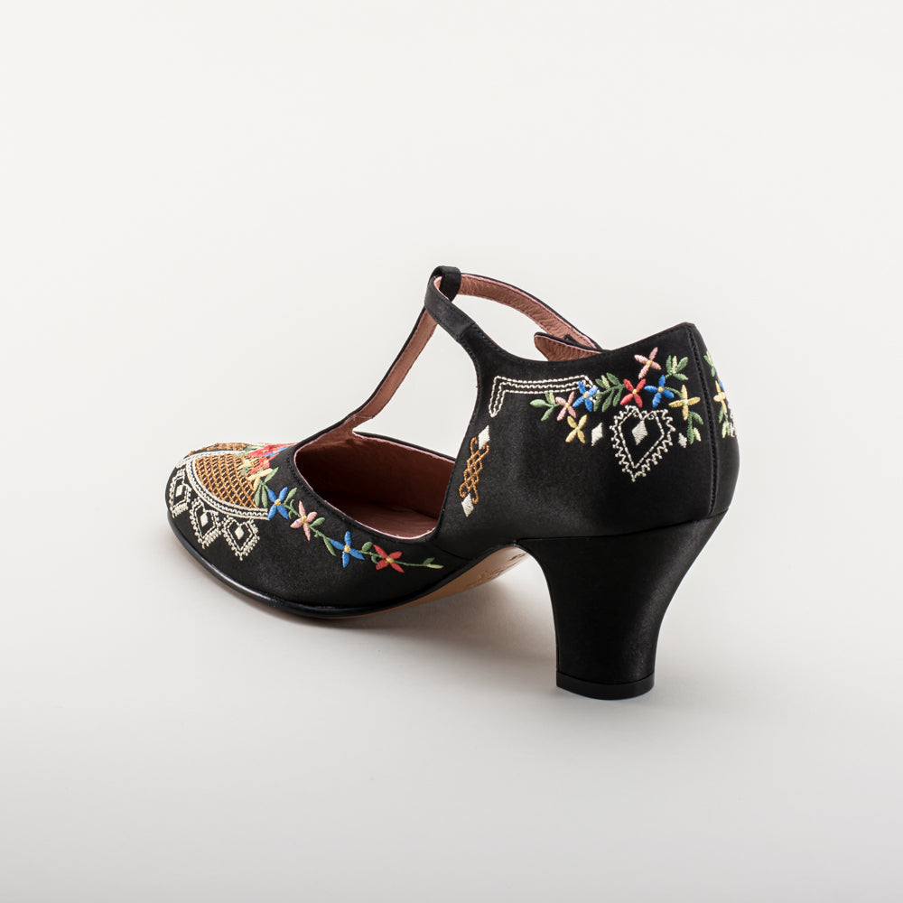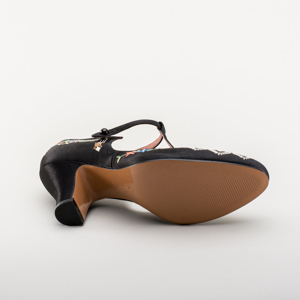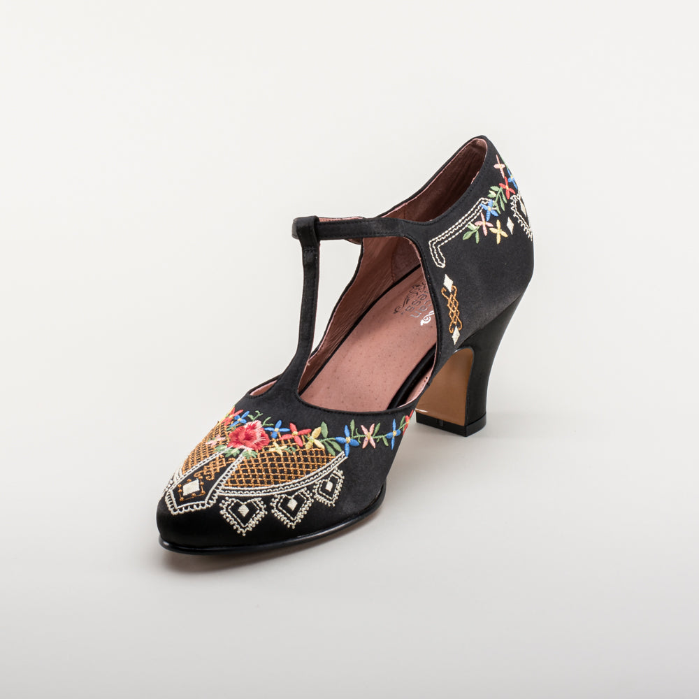 As hemlines rose in the 1920s, flashy footwear was all the rage, and the Daisy Embroidered T-Strap heels are just the ticket. Made in luminous satin heavily embroidered in a gorgeous botanical design, the Daisy T-Strap Shoes are closely based on an original pair in Bata Shoe Museum. These gorgeous shoes are accurate for the 1920s, 1930s, and 1940s, and offer our refined and stable 2.5 in / 6.3 cm Spanish heel paired with open sides and an almond toe.