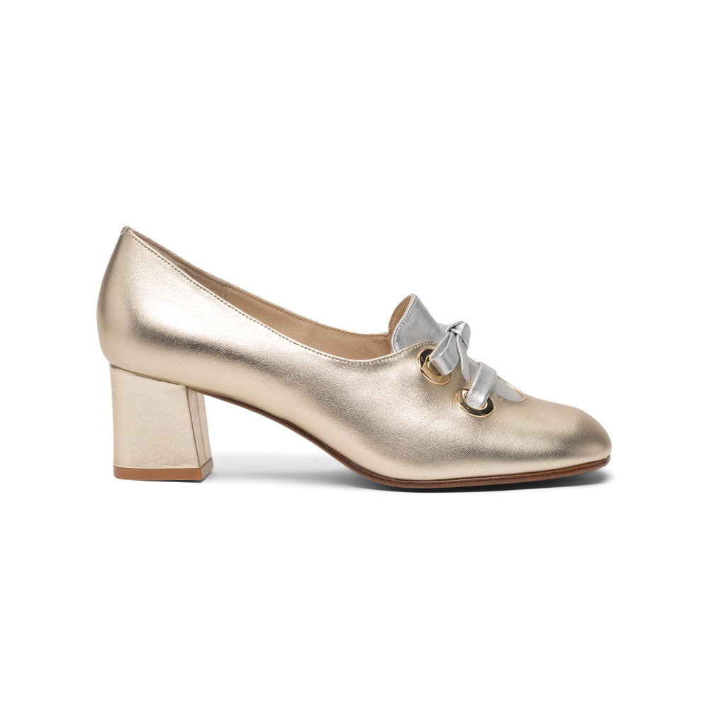 Welcome to the '60s! Pattie is our fab, far out, and first ever 1960s reproduction shoe. These cool slip-on pumps feature a custom, 1960s reproduction 2"/5.08 cm block heel, squared-off round toe, and a definitive and detailed 1960s shape, thanks to our new custom last. Based on period originals, Pattie has a fixed tie detail over the toe, as well as chunky '60s grommets. Choose from uppers in mid-century metallics or mod patent leathers. Pattie is available in both standard and wide. Note: patent leather is easily cleaned by wiping gently with a microfiber or damp cloth. We recommend against using water repellant sprays, waxes, or lustre creams.