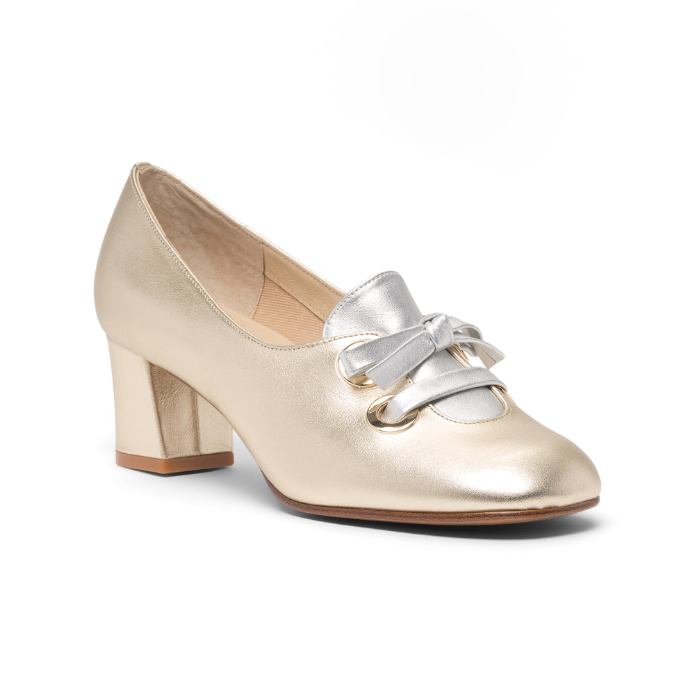 Welcome to the '60s! Pattie is our fab, far out, and first ever 1960s reproduction shoe. These cool slip-on pumps feature a custom, 1960s reproduction 2"/5.08 cm block heel, squared-off round toe, and a definitive and detailed 1960s shape, thanks to our new custom last. Based on period originals, Pattie has a fixed tie detail over the toe, as well as chunky '60s grommets. Choose from uppers in mid-century metallics or mod patent leathers. Pattie is available in both standard and wide. Note: patent leather is easily cleaned by wiping gently with a microfiber or damp cloth. We recommend against using water repellant sprays, waxes, or lustre creams.