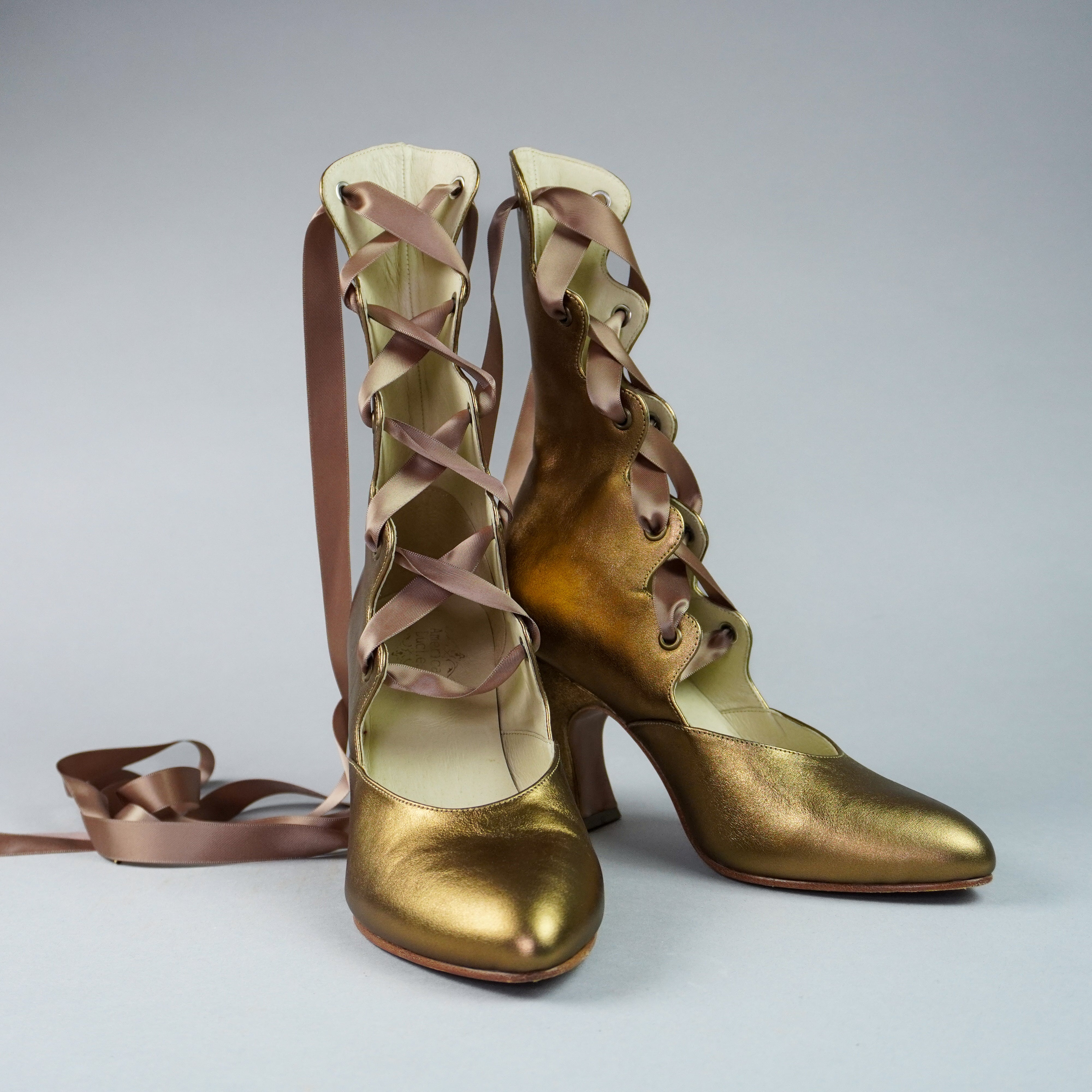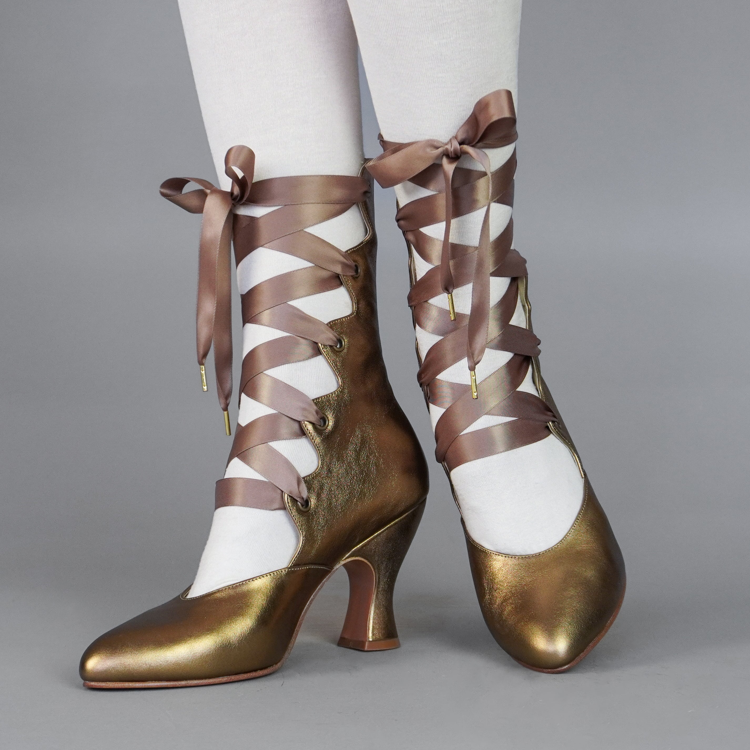 Tango Edwardian Boots are just as seductive as the Tango dance craze that swept the world in the 1910s. Designed to show off the legs, these gorgeous lace-up boots are based on several antique examples from 1900 through 1920. Tango features a deliciously curved shaft and scalloped tabs, which are laced with double-faced satin ribbon laces. Tango comes with two sets of ribbon laces, for adjustable sizing. Smooth leather uppers are stunning in a variety of beautiful colors. Tango sports a brand-new, custom 3.5 inch/ 8.9 cm French heel- our highest heel yet! Tango's heel is just as curvy and sumptuous as it is well-balanced, so you can dance the night away.