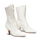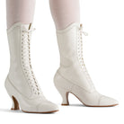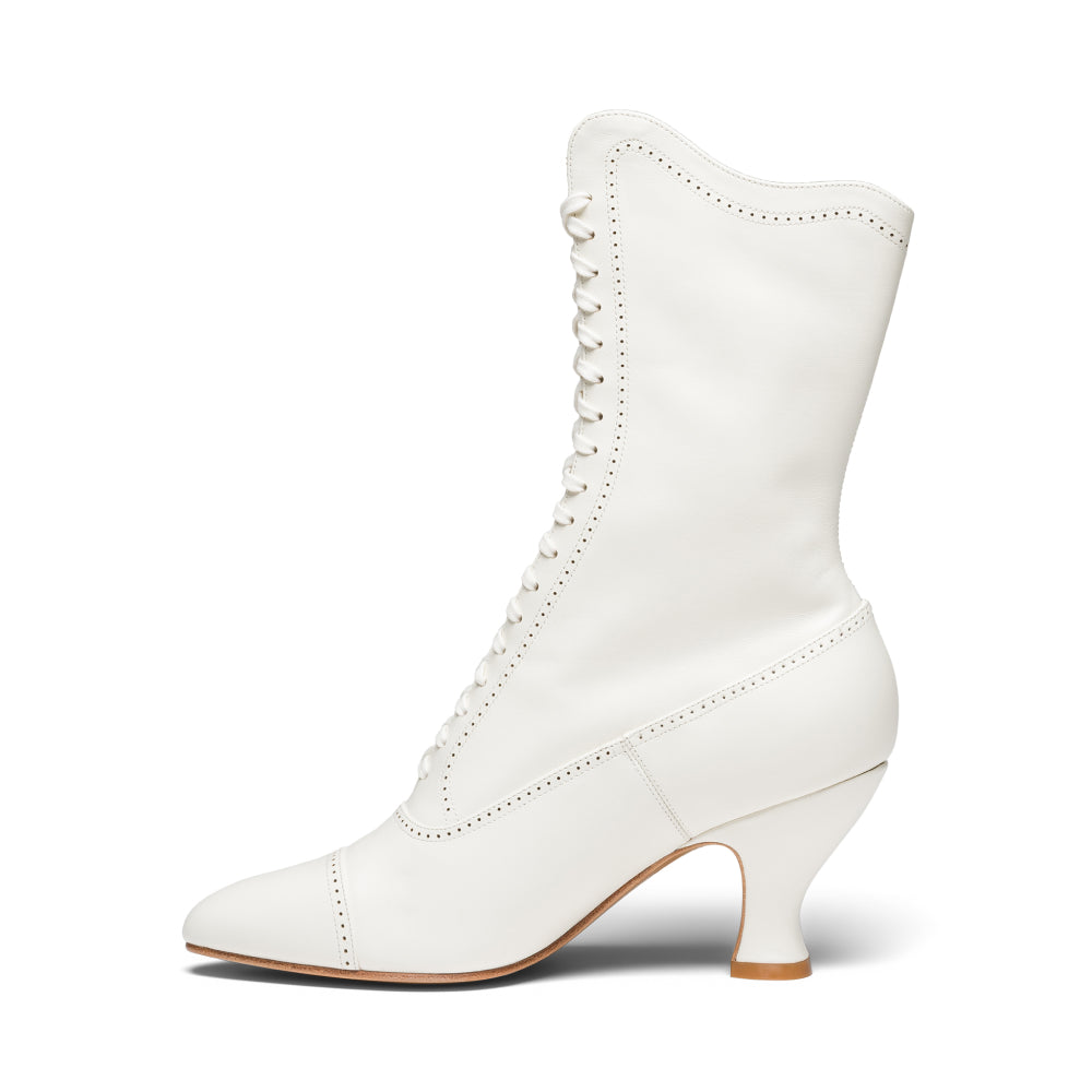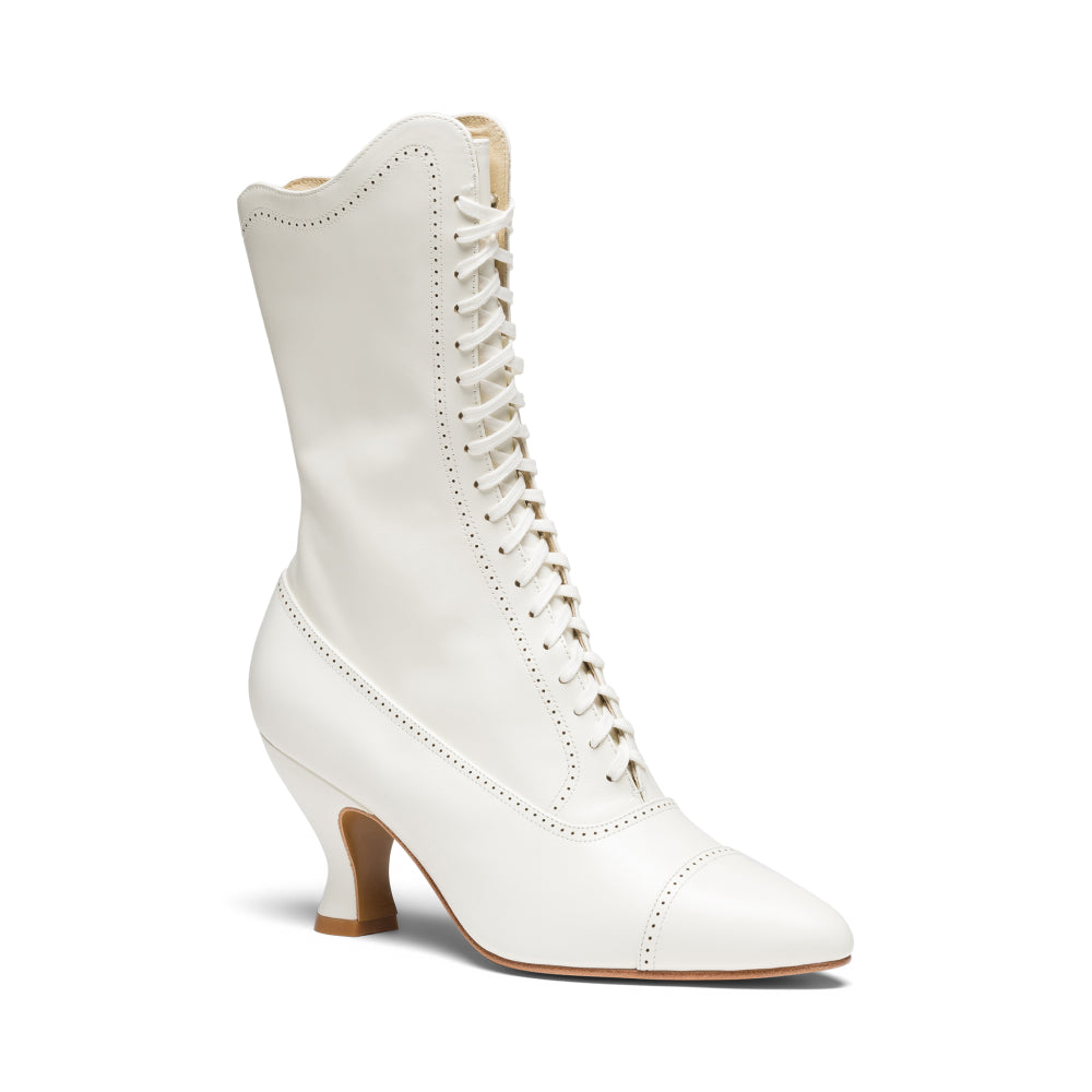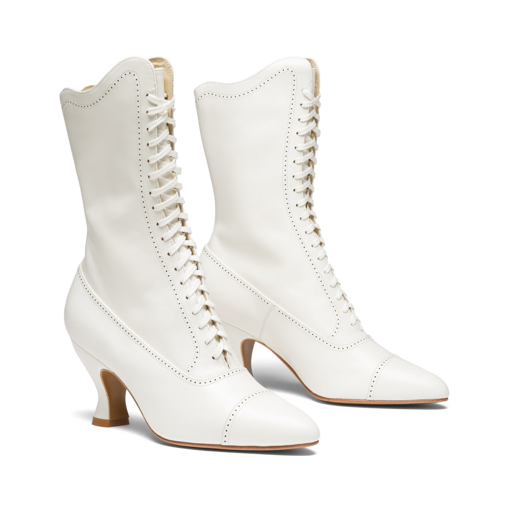 Introducing Edith, the spool-heeled Edwardian boot you have been dreaming of. Carefully designed and based on antique originals, Edith is accurate to 1890 through 1920. Edith features a custom, curvaceous, and perfectly-balanced 3”/ 7.6 cm French spool heel, which makes an ideal base for our custom last. Edith’s super-soft leather uppers are crowned with a splendidly shaped top, and set off by handsome broguing on the shaft and toecap. The period-accurate curve along the back of the boot gracefully hugs the calf, just like real Edwardian boots. Available in both standard and wide width, Edith fits a wide range of calf sizes. Each pair of Ediths comes with two sets of laces, for increased adjustability. The top of Edith Boots do not extend to the widest part of the calf muscle. Measurements scale slightly based on size.