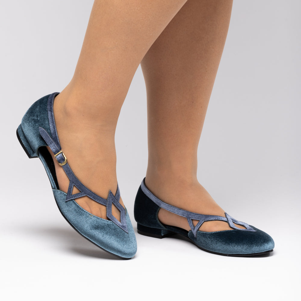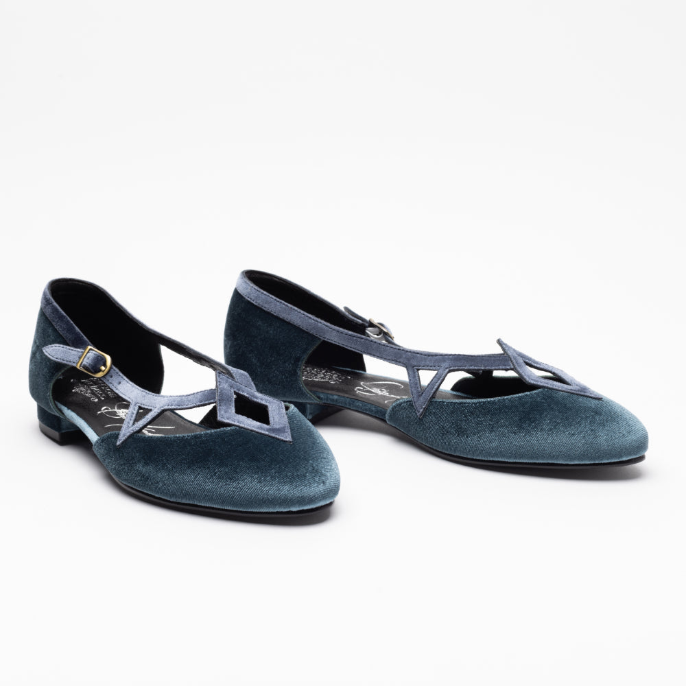 Step into a vintage-inspired fantasy with the Mildred Flats, from our collaboration collection with artist Christine McConnell! Inspired by 1950s 'flatties', these flats are unlike any you've seen before. Uppers in rich, luxe velvet, open sides, and strappy details festooned with geometric motifs make Mildred unique. Mildred features our dependable 0.5"/ 1.27 cm common sense heel, which is low and sturdy for all-day comfort. These shoes are festive, leather-free, and come in five gorgeous colorways.